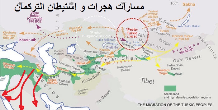 وبالعودة حول وجود التركمان وما يتعلق بهجرتهم الى الأناضول ومنطقة الشرق الأوسط نجد أن هناك اربعة موجات تركية منتظمة انطلقت من آسيا الوسطى سالكين خطوطاً مختلفة: فالخط الاول الطريق الشمالي من شمال بحر الخزر عابراً الى روسيا, والخط الثاني من جنوب بحر الخزر الى جزيرة العرب وآسيا الصغرى ومنها الى جزر بحر إيجة ومنها الى البلقان ويونان, والخط الثالث من فوق افغانستان الى هندستان. والخط الرابع طريق الموجة الكبيرة من فوق اراضي شرق تركستان ومن داخل حدود اسيا الوسطى الى الصين والشرق الأدنى. وهناك من يقول بأن اقواماً تركية كثيرة ومنذ 5- 6 الاف سنة ق.م.